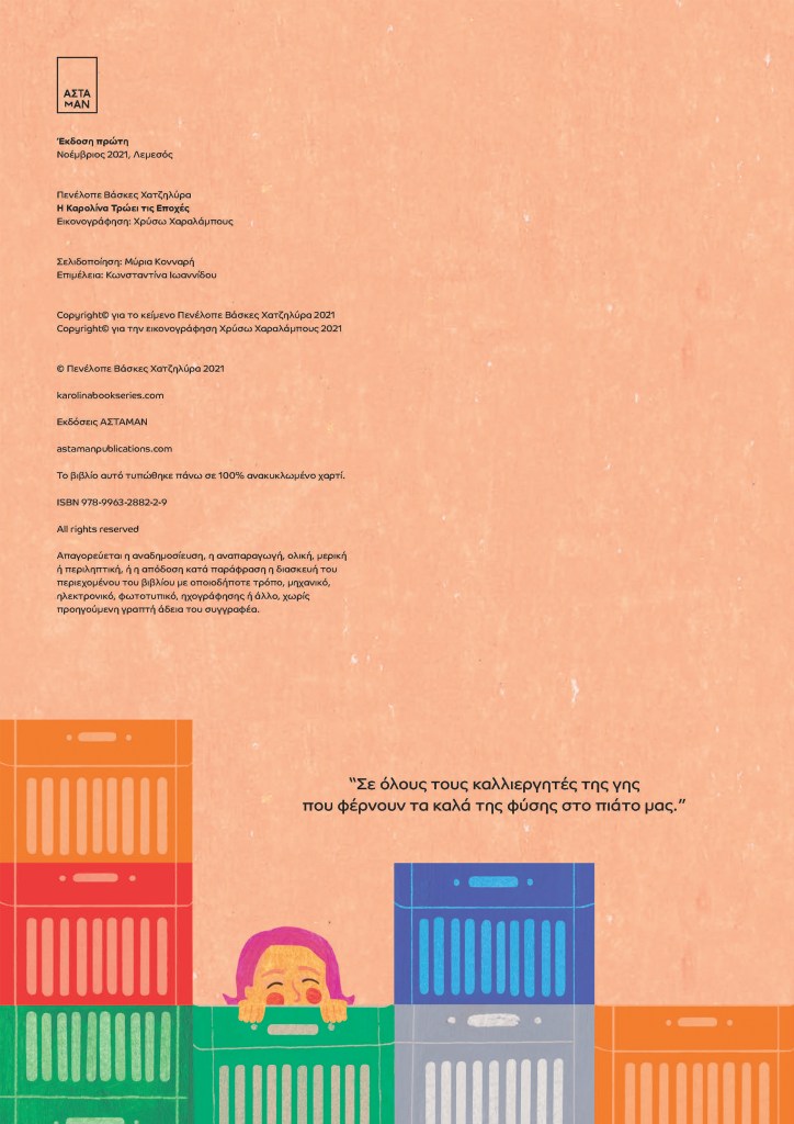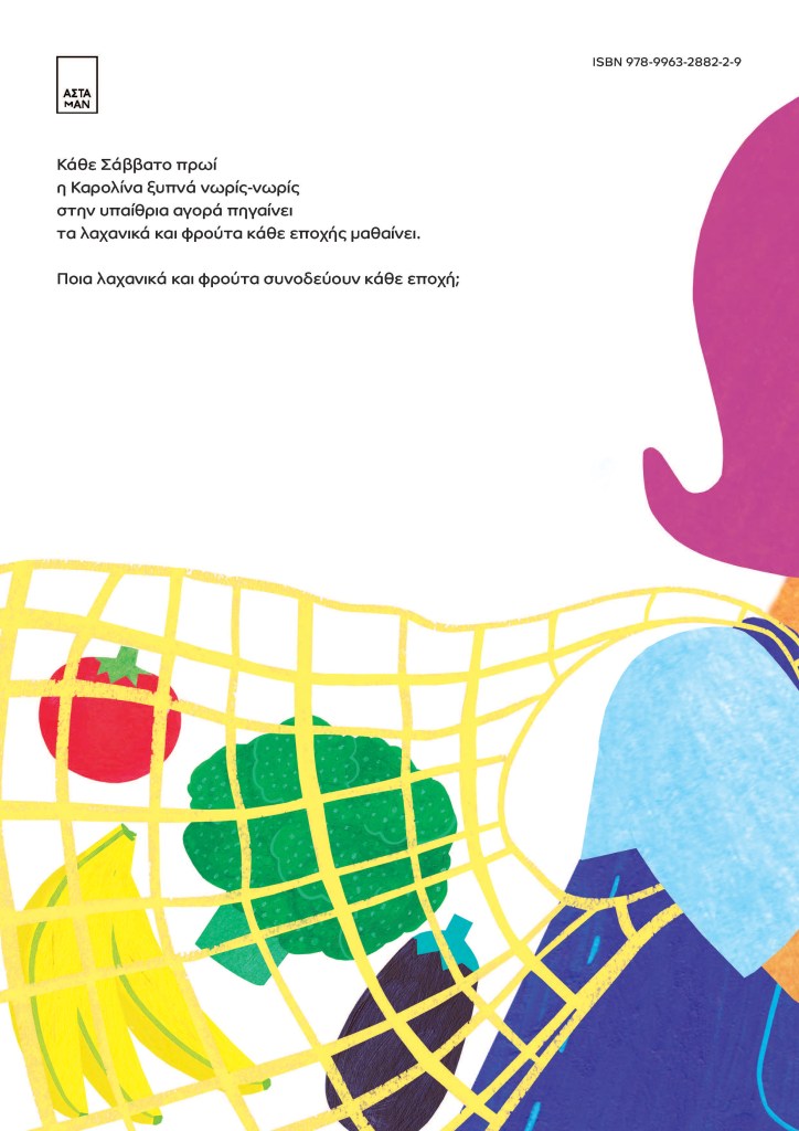 Στο παιδικό βιβλίο “Η Καρολίνα Τρώει τις Εποχές”, η Καρολίνα περιγράφει τις βόλτες που κάνει κάθε Σάββατο πρωί στην πολύχρωμη υπαίθρια αγορά. Όπως αλλάζουν οι εποχές, έτσι αλλάζει η ποικιλία των λαχταριστών λαχανικών και ζουμερών φρούτων που επιλέγει για το σπίτι.